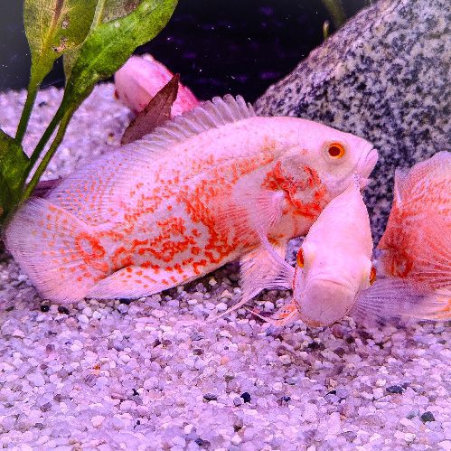 It is best to keep several Oscar together as smaller numbers tend to have more in-fighting and single Albino Orange Oscar is likely to become depressed and withdrawn. Tank mates can be added, but they must be large enough to not be viewed as food and robust enough to be able to defend themselves or not be considered weak. Larger synodontis catfish, Pictus Catfish and Large Plecos like Adonis and Gibbiceps are all good choices. These fish are however not suited to a community whatsoever.