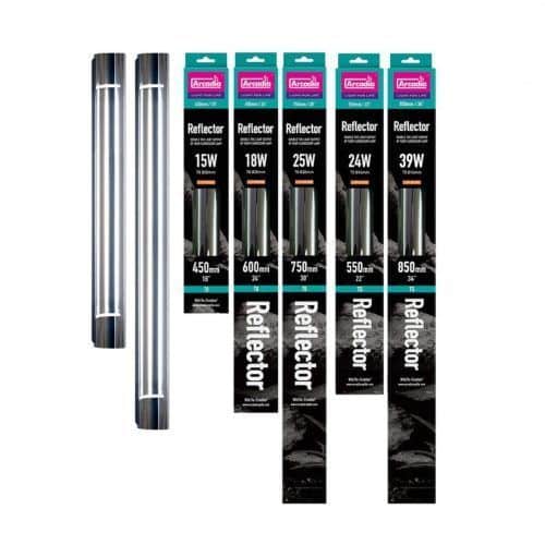 The Arcadia Tube Reflectors include an angled design and come with holding clips to connect the lamp reflectors to the tubes.