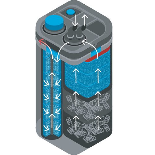 - LARGE FILTER VOLUME: The combination of highly effective biological filtering with Hel-X and mechanical/biological cleaning with filter sponges is ideally coordinated to ensure healthy and clear aquarium water. The water flows through the pre-filter first, ensuring an extra-long service life