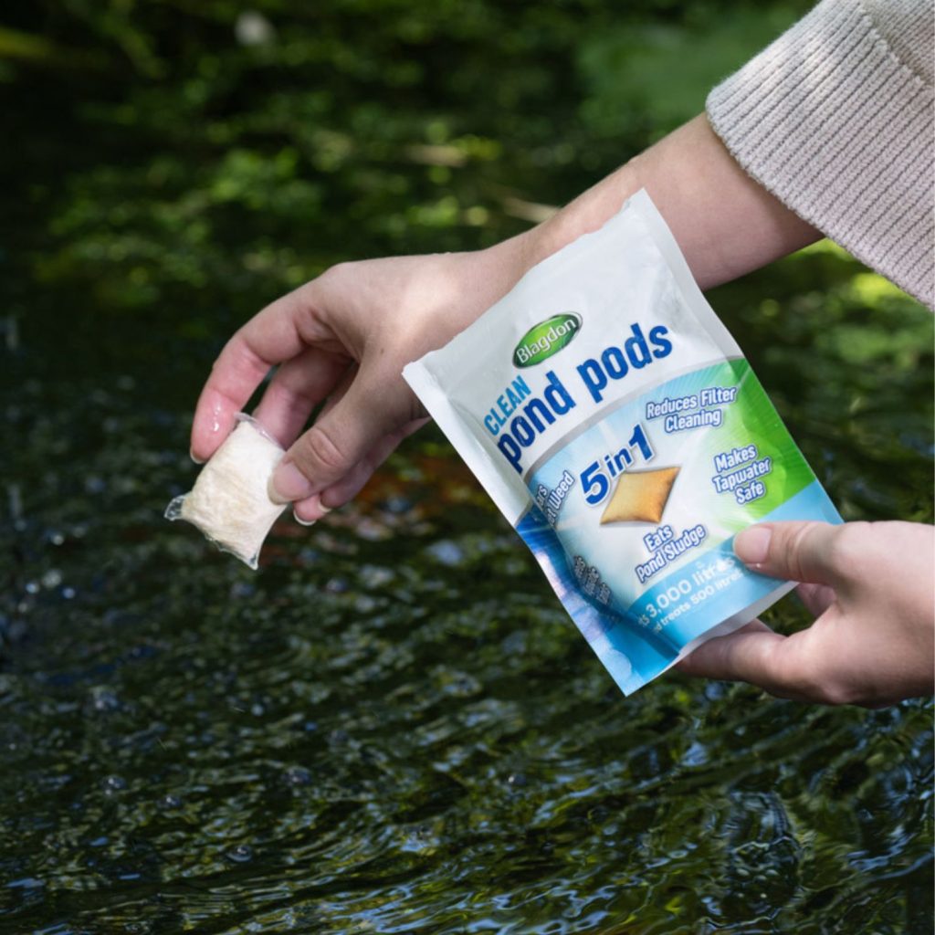 Blagdon Clean Pond Pods are an easy-to-use solution for some of the most common and frustrating pond problems. This unique formulation is made using Blagdons 50+ years of experience manufacturing pond treatments. With this, we have answered the age-old problems that pond-keepers face, in just one product. Issues such as: Filter maintenance, Blanketweed, Pond sludge, using tap water and the struggle to see pond plants thrive are all addressed head-on. The soluble pouches harmlessly dissolve, releasing the gentle active ingredients, getting straight to work to clean and clear your pond. Use Clean Pond Pods in conjunction with Clean Pond Machine Filter for exceptional results. However, Clean Pond Pods are also suitable for direct to pond use and with other filter systems. Due to the gentle and natural way Clean Pond Pods work within the pond ecosystem, results will be most effective when used over a consistent period of time and are not an overnight solution. Blanketweed reduction should become apparent within a month of starting treatment. For long-term effectiveness, usage should begin when temperatures reach 10°C around April in the UK – and continued monthly until daily temperatures drop below 10°C. This dosing schedule will maintain a clean and healthy pond and reduce filter maintenance throughout the pond season.
