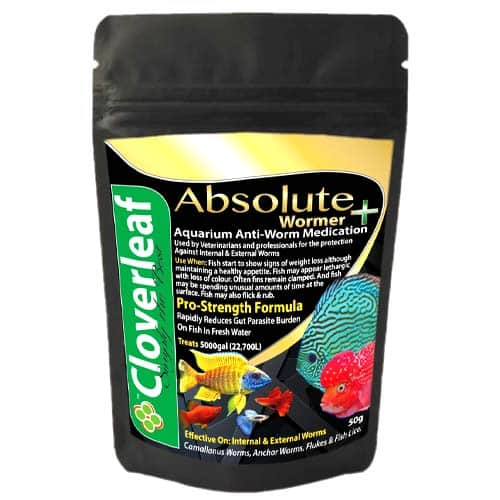 Cloverleaf Absolute Wormer + is an effective medication against Skin flukes (Gyrodactylus), Gill Flukes (Dactylogyrus), Internal Worms (Nematodes), Hexamita, Anchor worm (Lernea), Leeches (Piscicol) and Fish Lice (Argulus). With pH Buffer added in, this treatment makes sure to keep not only your fish but your water healthy.