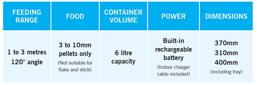 Weatherproof, evoFeed Automatic can be mounted pond side, and is powered via its own built-in, rechargeable battery.