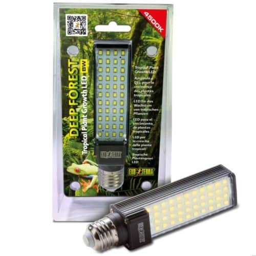 Exo Terra’s energy efficient, self-ballasted and screw-based Deep Forest is an ideal light source for bio-active planted terrariums. Its high visible light levels contribute to the physiological wellbeing of your reptiles, amphibians and invertebrates and lets them experience and perceive the colors in their environment more naturally. The Deep Forest’s specific composition of wavelengths in combination with the high light intensity contributes significantly to sustained, lush plant growth. The Deep Forest’s 4500K simulates the filtered sunlight conditions found in the Tropical Forest’s understory and Orchids, Bromeliads, Tillandsias (air plants), carnivorous plants, mosses and lichen living in the lower layers of the forest thrive under its strong Photosynthetic Active Radiation. Its wavelengths, composed of blue, green, red and even traces of far-red regulate a healthy growth rate and coloration of the leaves, stems, roots and even promote flowering.