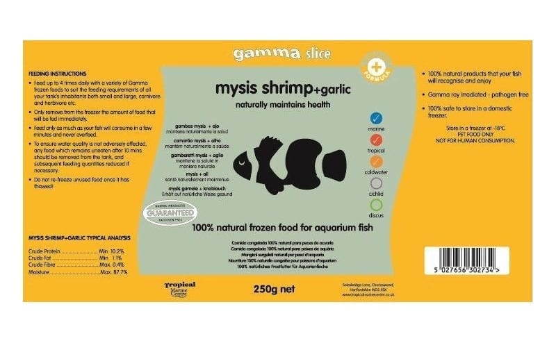 This Gamma Mysis Shrimp with Garlic food is suitable for fresh water, tropical, cold water, marine fish and cichlids. Feed only as much as your fish will consume in a few minutes. It’s important to feed a varied diet to keep fish in perfect health with great colours.