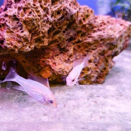 Frequent partial water changes are essential to the wellbeing of the Gold Ram as they are incredibly sensitive to Nitrates. Excellent water quality must be maintained at all times for these delicate fish, but flow shouldn’t be particularly powerful. Tank mates should be chosen carefully. They need to be able to thrive in soft acidic conditions and at higher temperatures as the Rams do best when it’s warmer. Several South American species of Tetra like cardinals, neons and rummies as well as corydoras will do great. Other potential tank mates could be Angelfish, Plecos and other peaceful catfish. Avoid any larger cichlids as they may stress the Rams out.