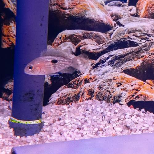 The aquarium should be aspacious with a soft sand substrate as this fish enjoys landscaping activities. The addition of rocks, wood, caves and other visual obstacles will provide stimulation and hiding places, as well as visual barriers that can help with controlling aggression. Plants may be added, but it’s best to choose robust species like anubias and java ferns as these fish may shred anything that’s soft enough. Floating plants are also welcome and will provide additional shady spots. As with all cichlids, this is a messy fish with a high protein diet and will need filtration that can handle it. The flow should be relatively gentle.