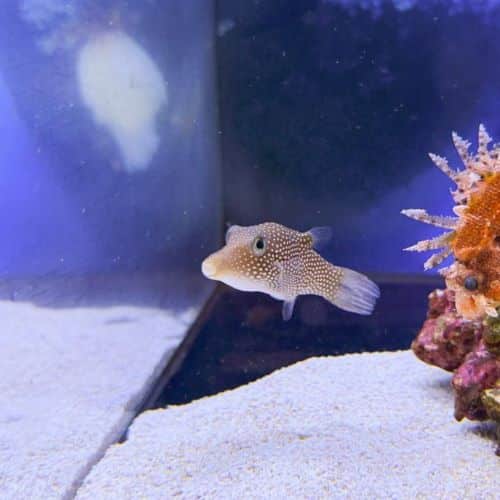 Found in reefs and reef adjacent habitats, the Honeycomb Toby Puffer is a small, adaptable fish. Once settled, this fish has a bold temperament as it carries toxins that ensure it isn’t preyed upon and like all puffers, it can inflate itself to almost twice its original size when frightened.