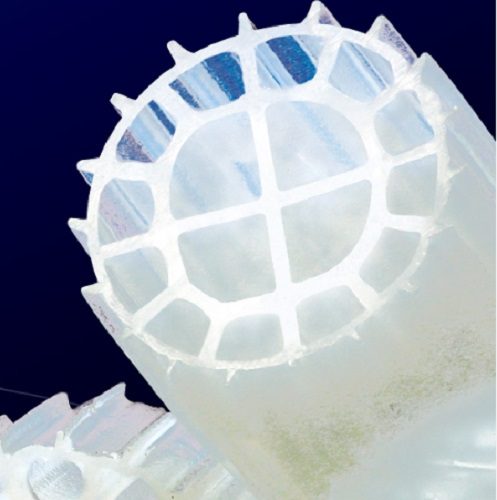 The addition of these minerals creates a rough surface on the media. This textured surface has a microscopic honeycomb of peaks and craters that allow waste particles to collect, and nitrifying bacteria to form. The minerals act as a food source for the bacteria, helping the bacteria to develop and multiply at a faster rate, further improving maturation times. Calcium alone has proven advantages for developing and maintaining effective bio-films. The enzymes that are added also help to make the media “sticky” so waste particles can adhere to media easier. Salt is added during the extrusion process, which is dissolved during the cooling process, leaving a rough surface on which bio-film can easily adhere.