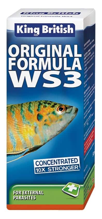 King British Original Formula WS3 White Spot Control is a veterinary medicine for the treatment of fish infected with White Spot. Also known as Ich or Ichthyopthirius, this is a persistent protozoan parasite that exhibits itself as pinhead-sized white spots.Costia & Trichodina can also be controlled with this product. WS3 is our strongest strength formulation against white spot.