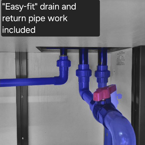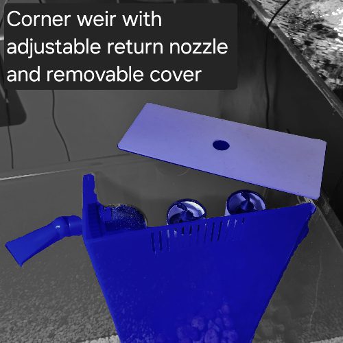 Drain and return pipe work are housed behind a colour coded acrylic weir. The weir sits in the right hand corner as opposed to central. This offers better opportunities for aquascaping and also improves circulation within the aquarium. Other brands choose central placement.