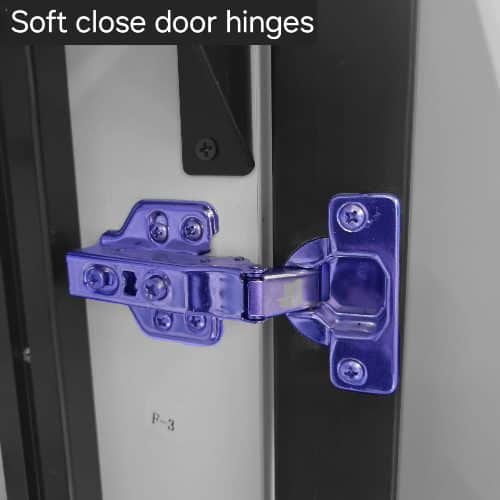 Each door is composed of a metal frame and coloured glass cover, giving a piano gloss finish. Soft close hinges are used and a โpush to closeโ door catch ensures the sleek lines are not interrupted with awkward handles. Cabinet looks sleek and modern.