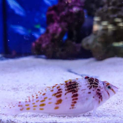 The Rock Hopper Hawkfish is a wonderful little fish that adds a burst of life to the aquarium. They only grow to around 12cm in size, but they’re a very active, playful and inquisitive species. They enjoy darting in and out of the rock work and will spend a lot of time out in the open, giving the aquarist plenty of entertainment.