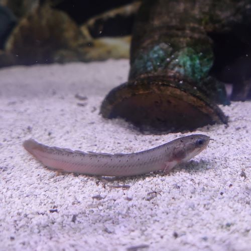 The Senegal Bichir is a large predatory fish that’s widespread in Africa. This species is largely nocturnal, hunting at night. The aquarium should be 6ft long to house one of these as they are a very long fish. Substrate should be soft sand and the lighting dimmed or diffused with floating plants. The addition of rockwork and bog wood will offer this fish places to hide and explore. A tight fitting lid with any gaps plugged is essential as Bichirs are accomplished escape artists and are able to breathe atmospheric air through their modified swim bladder. They are obligate air breathers, so it is imperative that they are able to access the water’s surface or they will actually drown. Filtration needs to be able to handle the meaty diet of this fish, but flow should be fairly gentle. Bichirs have very poor eyesight, but an excellent sense of smell. Many have been observed lifting their heads when food has been added to aquarium and sniffing out its location.