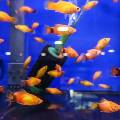 Like all livebearers, platies have a tendency to breed relentlessly and the males can be very persistent. As they are social fish, they need to be kept in groups of 6 or more individuals, ensuring that the females outnumber the males three to one. Getting an all male group however will guarantee population control. All female groups can be problematic as it isn’t uncommon for females to already be expecting when they are bought. As they are livebearers, the females will carry the eggs within themselves instead of depositing them. The eggs will eventually hatch and the female will quite literally give birth to the fry. Platies don’t tend to eat their own fry as long as there’s plenty of food.