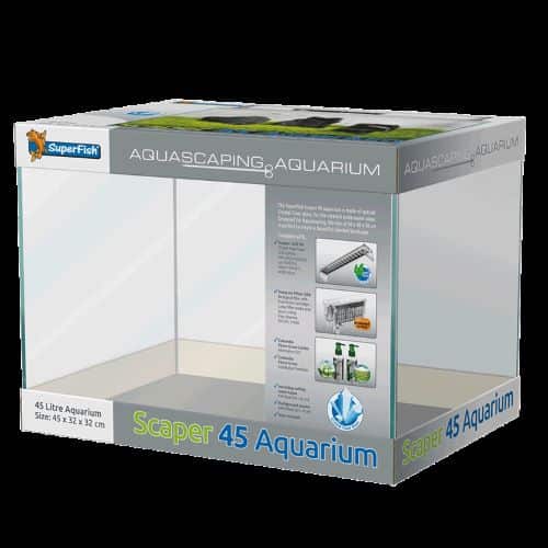 Scaper Crystal Clear Glass SuperFish Scaper Crystal Clear aquariums are designed for aquascaping. The size is perfect for creating beautifully planted underwater nano landscapes and the sleek design fits into any interior. Each Superfish Scaper comes with a safe EVA foam pad and a background poster with a black side and white side. The aquarium  is rimless and open top to create that perfect scape without ugly plastic trims and other visual distractions.