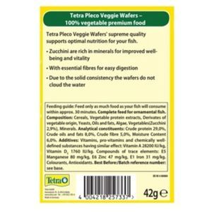 Tetra Pleco Veggie Wafers offer optimum nutrition for herbivorous bottom-dwelling fish. The wafers contain zucchini, which is rich in minerals and enhances the well-being and vitality of the fish. The food also contains essential fibres that support healthy digestion. Furthermore, the wafers are characterised by great dimensional stability, with all the essential nutrients being retained in the food until the very last bite. Thanks to their solid consistency, the wafers do not cloud the water.
