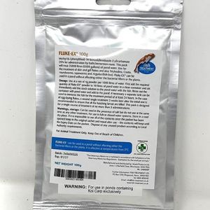 Dosage: Use this fluke treatment at a rate of 4g powder per 1000 litres of water. First add the required quantity of Fluke-EX® powder to 10 litres of pond water in a clean container and stir. Immediately add this stock solution to the pond water with the fish. Rinse out the container with pond water and add to the pond. If necessary a separate tank can be used to immerse the fish for the treatment period of at least 24 hours.