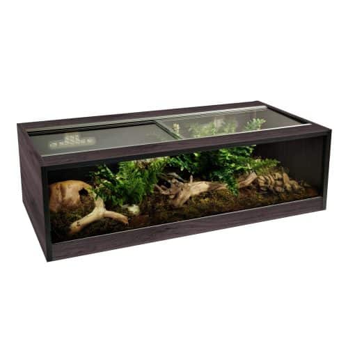 Repti-view Home includes Vivexotic’s easy vent system, an innovative cable access system allowing you to easily remove the specially designed access vents and remove cables and plugs. To prevent escapes even further, the Repti-View vivariums are supplied with a pre-drilled sliding glass lid and a removable “Slidestopper” door plug. They are also equipped with a solid glass base, optimal for a heat mat and easy temperature control with no risk of accidental exposure to moisture. Made for terrestrial reptiles, Repti-View Home has been designed in three stylish wood finishes, oak, black and grey to compliment any home decor and is available in two sizes.