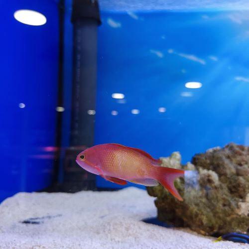 Wreck Fish or Lyretail Anthias are a social species that like to live in large shoals in the wild. The males tend to be very territorial, so typically one male will have a harem of many females. In the aquarium this should be replicated, but if a male can’t be obtained, then an all female group will suffice as the dominant female will become male in the absence of a male. The group must be of 8-10 individuals in order to spread out the aggression. If there are too few, the lowest ranking fish is likely to be bullied persistently. However, if the aquarium can’t accommodate a large group, then a single specimen would be advisable. This is quite a boisterous species and should not be housed with mild mannered fish that are easily intimidated or outcompeted for food. Direct food competitors should be avoided as this fish may bully or chase them. Equally, large aggressive species may frighten this fish and prevent it from being able to feed.